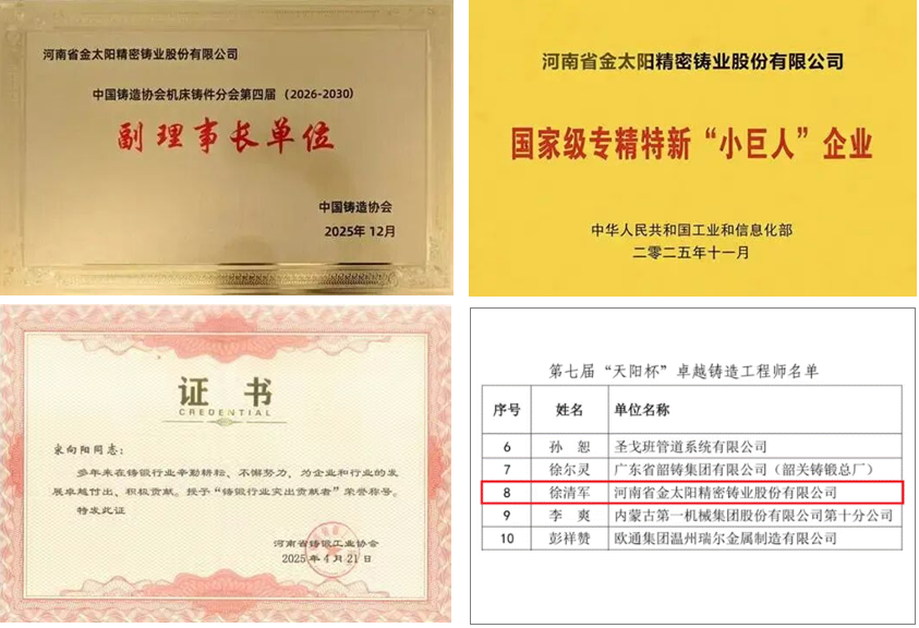 品牌影響力持續(xù)躍升:我們當(dāng)選機(jī)床鑄件分會(huì)副理事長單位、河南省鑄協(xié)青年企業(yè)專委會(huì)首任輪值理事長單位,成功承辦中鑄協(xié)三項(xiàng)機(jī)床鑄件標(biāo)準(zhǔn)研討會(huì),并牽頭兩項(xiàng)標(biāo)準(zhǔn)立項(xiàng),在行業(yè)標(biāo)準(zhǔn)制定中邁出實(shí)質(zhì)性步伐;通過國家級(jí)專精特新“小巨人”企業(yè)復(fù)審,董事長宋向陽斬獲鑄造行業(yè)突出貢獻(xiàn)獎(jiǎng),技術(shù)總監(jiān)徐清軍獲評(píng)鑄造卓越工程師、三名員工獲得行業(yè)技術(shù)能手,一系列榮譽(yù)資質(zhì)讓“金太陽”的品牌名片愈發(fā)閃亮。